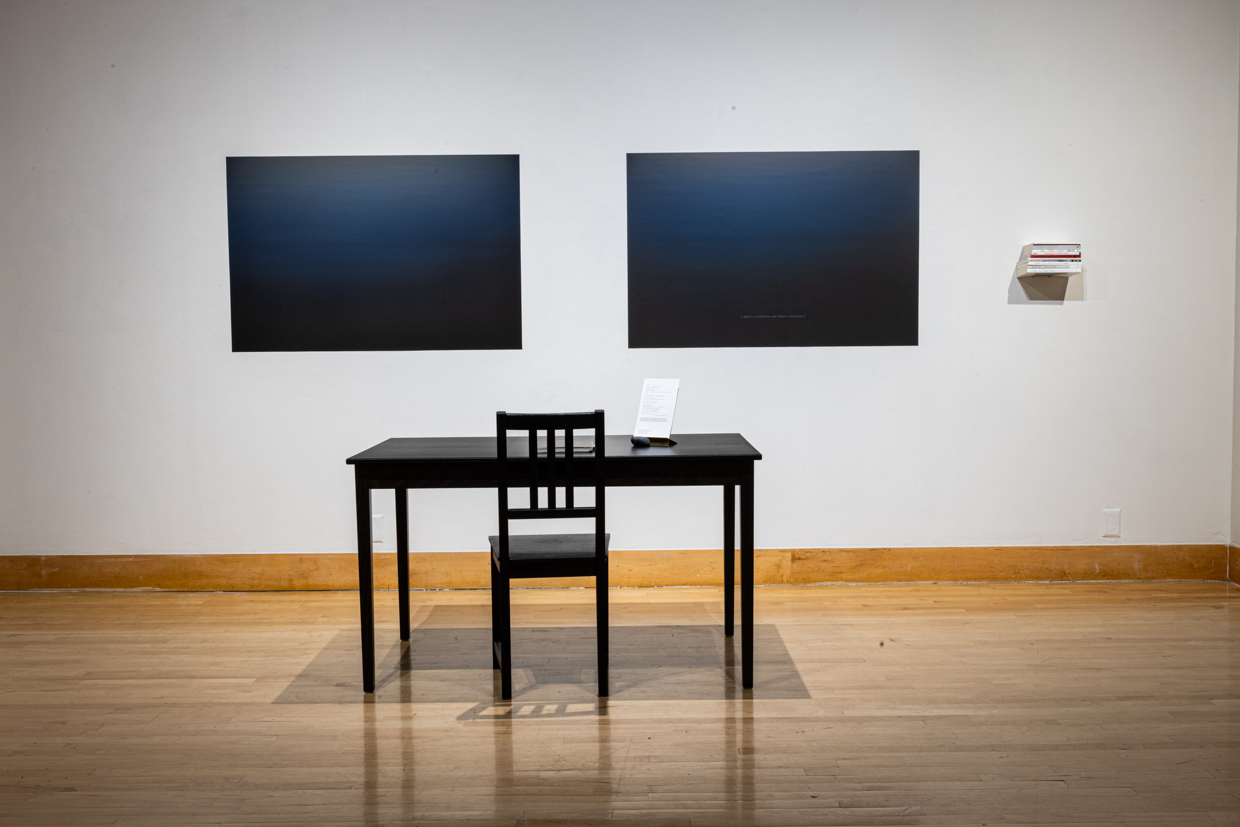 Exhibition install shot: Joshua Moreno, Tiazong Jiang, and Elaine Nguyen